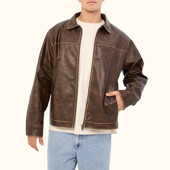 नए डिजाइन लंबी आस्तीन धोया हुआ भूरे रंग के पु चमड़े के जैकेट जिप फ्रंट जेट्स कस्टम लोगो जैकेट